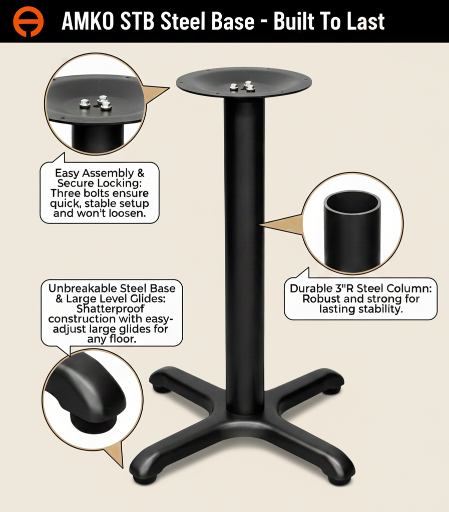 The AMKO STB steel table base is designed for reliable performance in commercial restaurant and hospitality environments. Heavy-duty steel construction provides excellent stability and long-term durability for daily use. Finished in black, it offers a clean, neutral look that pairs easily with a wide range of table tops. Available in dining and bar heights, it supports flexible layouts for indoor and outdoor settings.